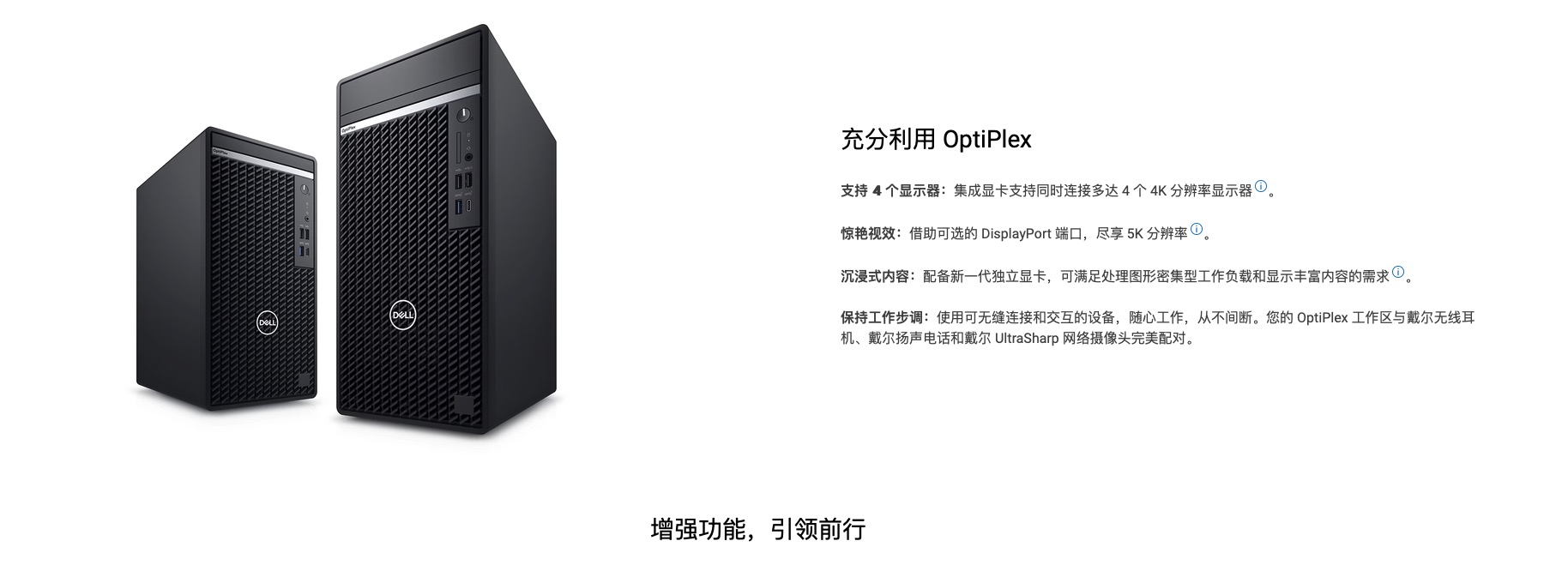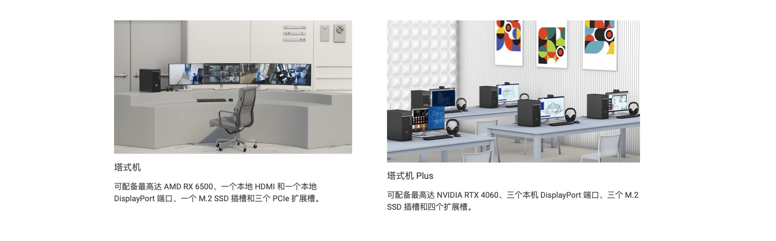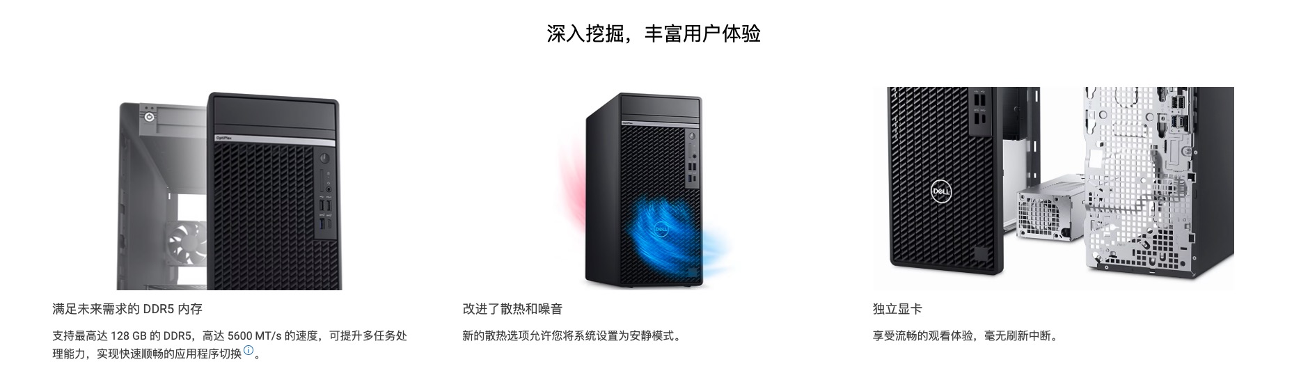 OptiPlex 塔式机提供卓越的台式机可配置性,以及丰富的存储和扩展选项。塔式机专为处理丰富的内容而打造,可提供卓越的性能和显卡选项,让您享受沉浸式工作体验。以下是主要区别: