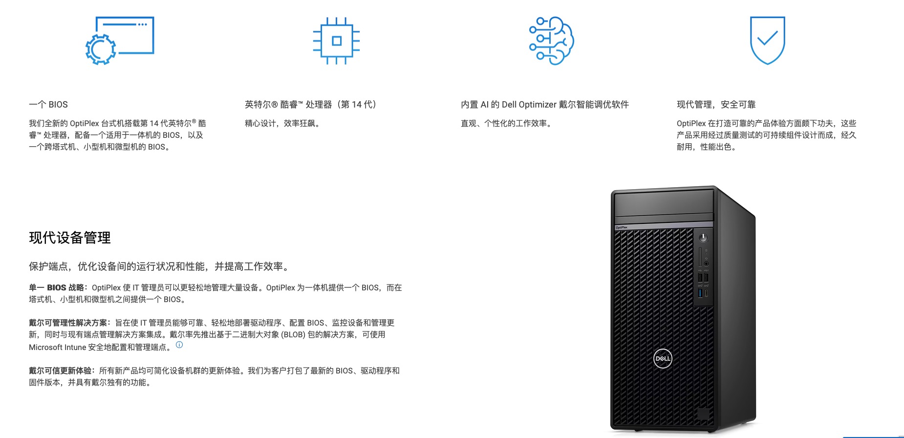 简化的管理:我们全新的 OptiPlex 台式机搭载英特尔® 酷睿™ 处理器(第 14 代),配备一个适用于一体机的 BIOS,以及一个跨塔式机、小型机和微型机的 BIOS。